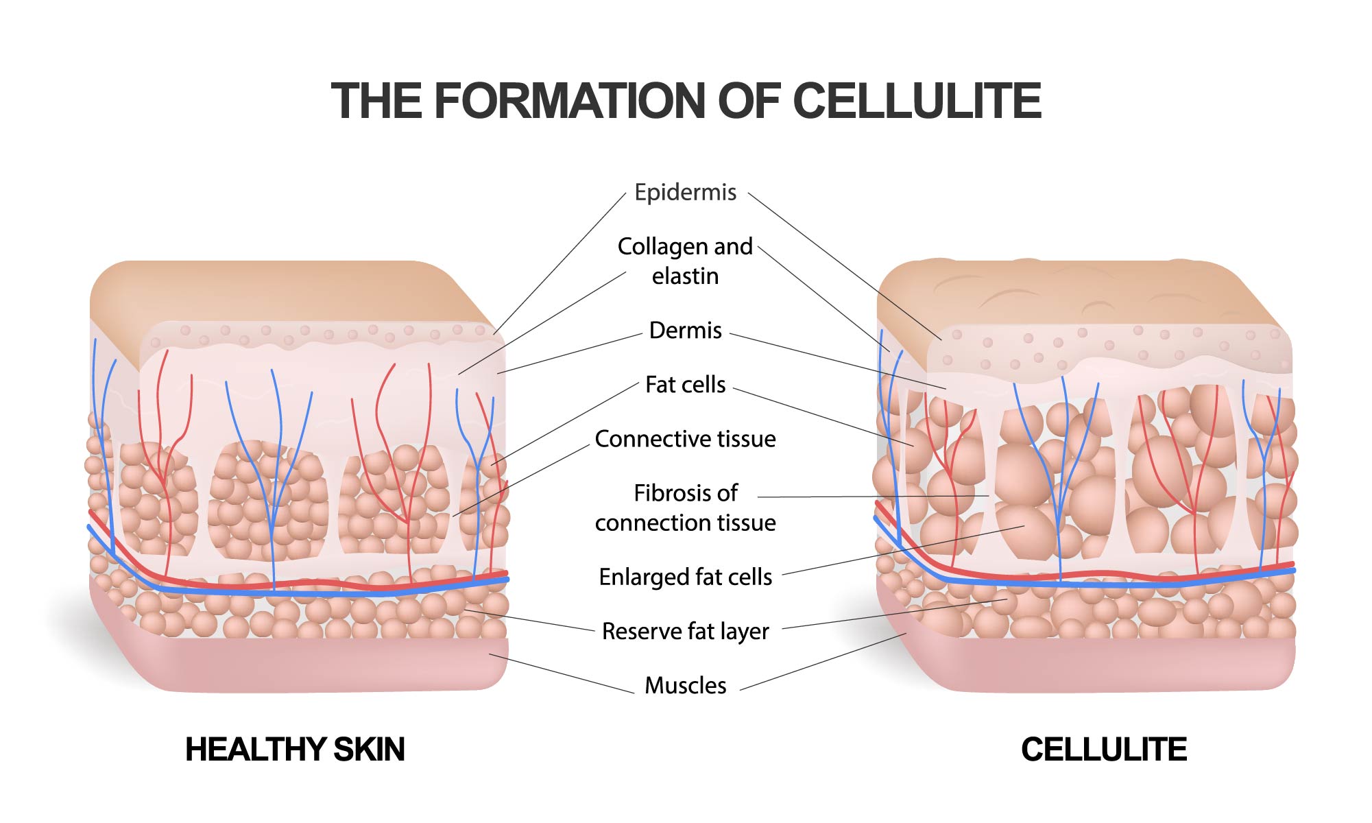 La cellulite est constituée d’adipocytes (cellules graisseuses) de grande taille, situées sous la peau, qui se gorgent de graisse et s’hypertrophient.